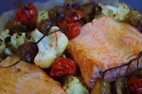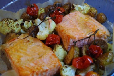 Kuumuta ahi 220 kraadini. Lõika suuremad kartulid pooleks, sega kõik 1 sl õliga ja tõsta 20 minutiks ahju röstima. Sega lillkapsas 1 sl õliga ja lisa kartulite juurde ning küpseta veel 15 minutit. Kata roog kirsstomatite ja palsamiäädikaga ning kaheks tükiks lõigatud lõhega, millele on niristatud 1 sl õli. Hoia veel10-15 minutit ahjus. Riputa valmis roale soola.
