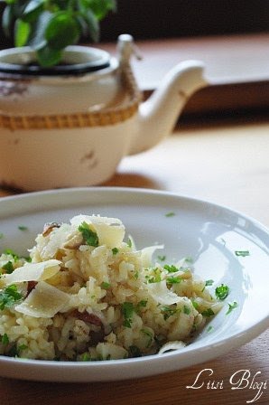 Aja potis õli tuliseks, lisa riis ja kuumuta segades, kuni see on läbipaistev. Lisa tükeldatud seened ja hakitud sibulad, pruunista 2–3 minutit. Lisa ka purustatud küüslauk ja valge vein, sega läbi ning hauta madalal kuumusel. Kui kogu vedelik on riisi imendunud, kalla potti osa puljongist, nii et vedelik katab riisi. Hauta 30 minutit, lisades ülejäänud puljongi siis, kui eelnev on imendunud. Pärast riisi pehmenemist maitsesta risoto soolapipraga, sega hulka hakitud petersell ja Parmesan.