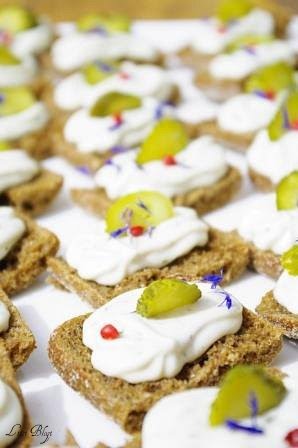 Valmista heeringavaht köögikombainis heeringafileest, toorjuustust, hapukoorest ning maitserohelisest. Lõika koorikleib sobivateks suurusteks ja kata tordipritsi abil heeringavahuga. Kaunista hapukurgiviilu, kuivatatud rukkilille õielehe ja roseepiprateraga.
