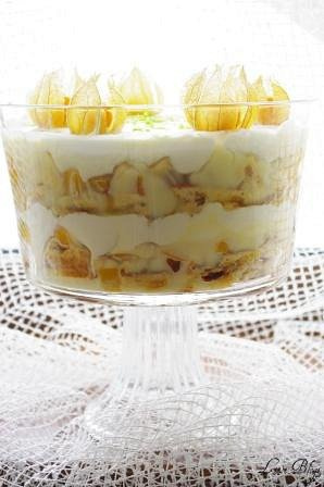 Mikserda kohupiimapasta sidrunimahla, tuhksuhkru ja vanillsuhkruga. Vahusta vanillkaste. Murra biskviitpõhi tükkideks ja lao serveerimisnõu põhja ning immuta kompotivedelikuga. Laota biskviidikihile pool virsiku- ja pool banaanitükkidest. Nirista peale karamellkastet ning selle peale 1/2 vanillkastet. Laota kõige peale 1/2 kohupiimasegust. Korda sama järgmise kihiga. Pealmiseks peab jääma kohupiimasegu kiht.