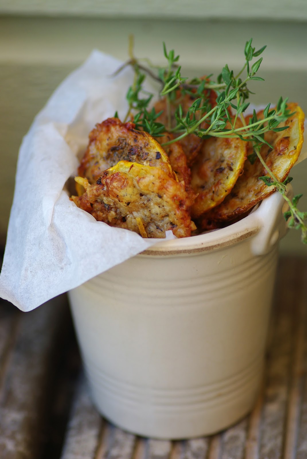 Lõika suvikõrvits õhukesteks viiludeks. Lao viilud küpsetuspaberiga kaetud ahjuplaadile, nirista peale veidi oliivõli. Riivi juust ja sega hakitud tüümianiga. Tõsta igale suvikõrvitsaviilule umbes teelusikatäis juustu. Küpseta 220-kraadises ahjus 20-25 minutit kuni juust on pealt kergelt pruunistunud. Lase 5 minutit ahjuplaadil jahtuda. Serveeri.