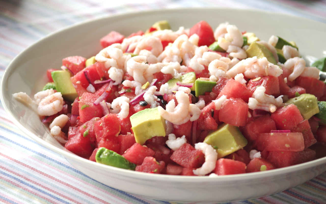Lõika sibul pikuti pooleks ja haki õhukesteks viiludeks. Eemalda tšillikaunast seemned ja haki tšilli hästi peeneks. Haki küüslauk. Sega suures kausis sibul, tšilli, küüslauk, sidrunimahl, valge veini äädikas, suhkur, soola ja pipar. Lase veidi maitsestuda. Lisa kuubikuteks lõigatud arbuus ja avokaado ning sega läbi. Puista peale krevetid. Serveeri.