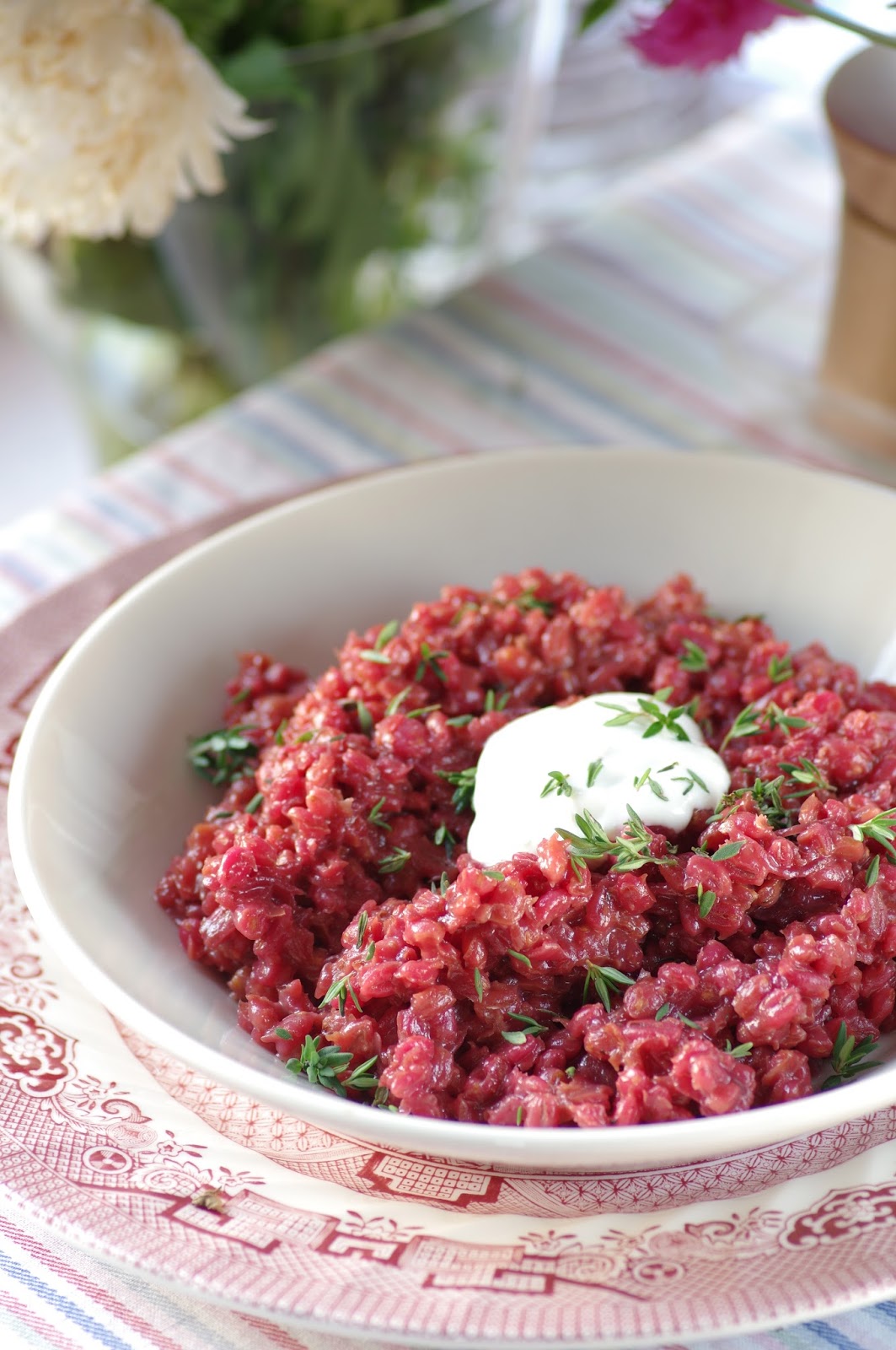 Haki sibul ja küüslauk, riivi peet peene riiviga. Kuumuta pannil õli, hauta sibulat madalal kuumusel. Lisa pannile küüslauk ja riivitud peet. Kuumuta paar minutit. Pese kruubid voolava vee all ja lisa pannile. Tõsta kuumust, lisa vein ja lase aurustuda. Vala pannile niipalju kuuma puljongit, et kruubid saaksid kaetud. Lase keskmisel kuumusel haududa. Kui puljong on peaaegu imendunud, lisa taas paar kulbitäit puljongit. Jätka puljongi lisamist kuni kruubid on pehmeks haudunud, sealjuures orsotot aeg-ajalt segades. Sega juurde värske tüümian. Serveeri.