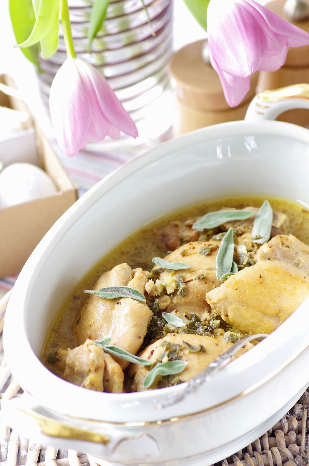 Pane küüslauk potti kanatükkide juurde. Kalla peale sinepikaste. Aseta kanale võitükid. Küpseta 200-kraadises ahjus 1 tund. Poole peal keera kanatükid mõneks ajaks ka teise poolega kastme sisse küpsema.