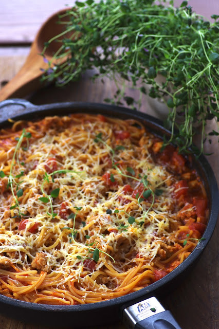 Kanahakklihast ja spagettidest tõeline mugavusroog. Toit valmib lihtsalt ja kiiresti ning selleks on tarvis vaid ühte potti või sügavamat panni. Vähese vaevaga valmib pannitäis aromaatse tomatikastmega pastarooga, mille järel isegi taldrikud puhtaks limpsitakse.