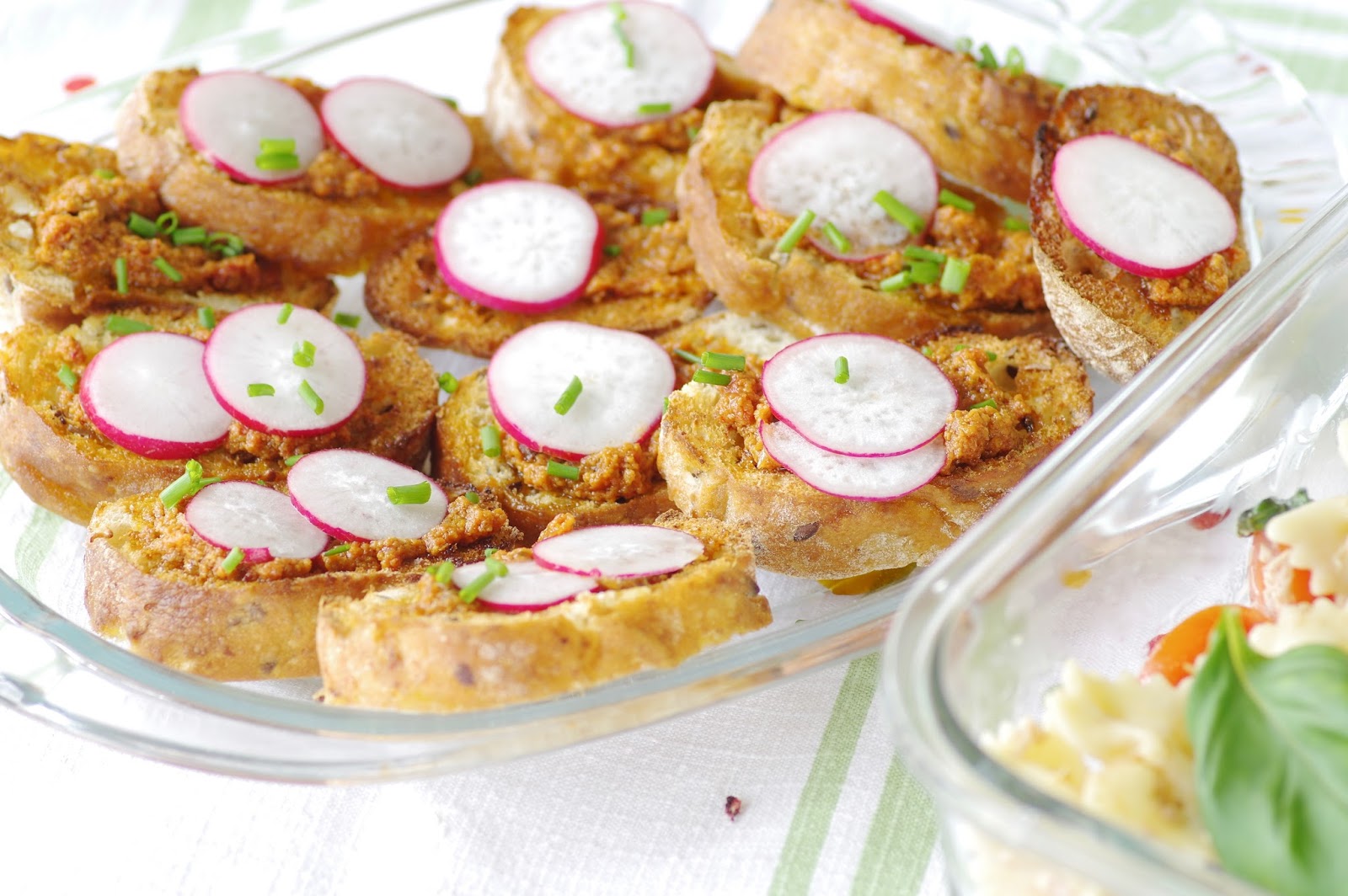 Salati kõrvale tegin krõbesaiu punase pestoga, mis valmistasin päikesekuivatatud tomatitest, toorjuustust ja parmesanist. Peale värsket kevadist redist ja murulauku.