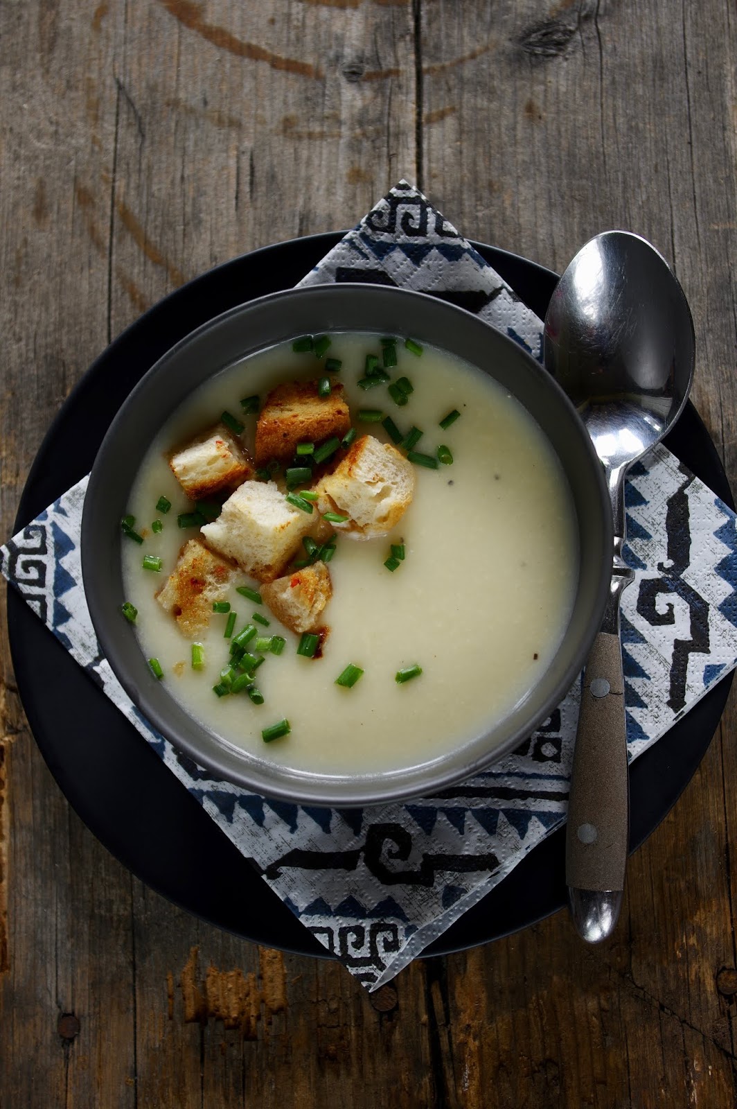 Tükelda porru ja küüslauk. Kuumuta potis õli, hauta porrut ja küüslauku (ära pruunista!) mõni minut. Lisa tükeldatud lillkapsas ja vala peale kuum vesi. Keeda kuni lillkapsas on pehme. Püreesta. Sega hulka riivitud juust, toorjuust, maitsesta muskaatpähkli, musta pipra ja vajadusel soolaga. Serveeri krõbedate saiakrutoonidega.