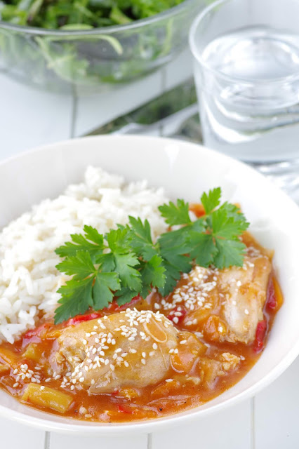 Oleme köögiviljasalatit söönud niisama lisandina, aga olen kasutanud seda ka magus-hapu kastmena kana juurde. Selleks pruunista kanatükid, lisa magus-vürtsikas salat ja veidike vett ning ongi valmis.