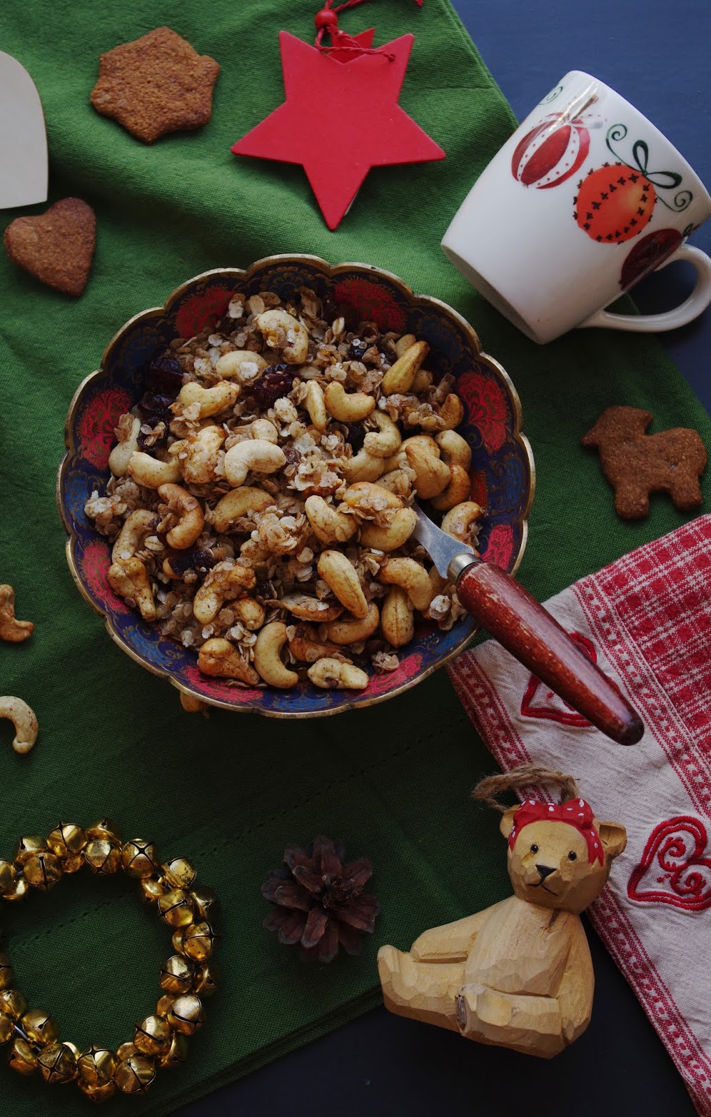 Pühade ajal serveerin hommikuks mõnusalt krõbedat jõuluvürtsidega müslit. Kuigi harilikult kasutan müsli valmistamiseks täistera kaerahelbeid, siis viimaste puudumisel asendasin need seekord odrahelvestega. Odrahelbed jäid müslis nii mõnusalt kõrbedad. Lisasin veel erinevaid pähkleid ja kuivatatud jõhvikaid ning jõuluvürtse.
