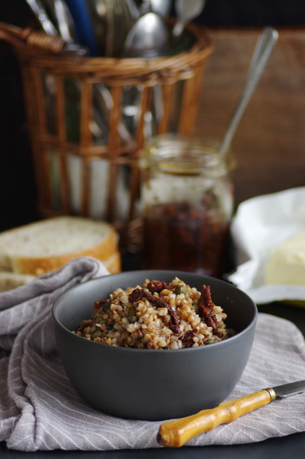 Hapukad kapparid ja küllusliku maitsega päikesekuivatatud tomatid annavad tatrale ülihea maitse ja põneva tekstuuri. Peale niristan veidike tomatite purgist õli.