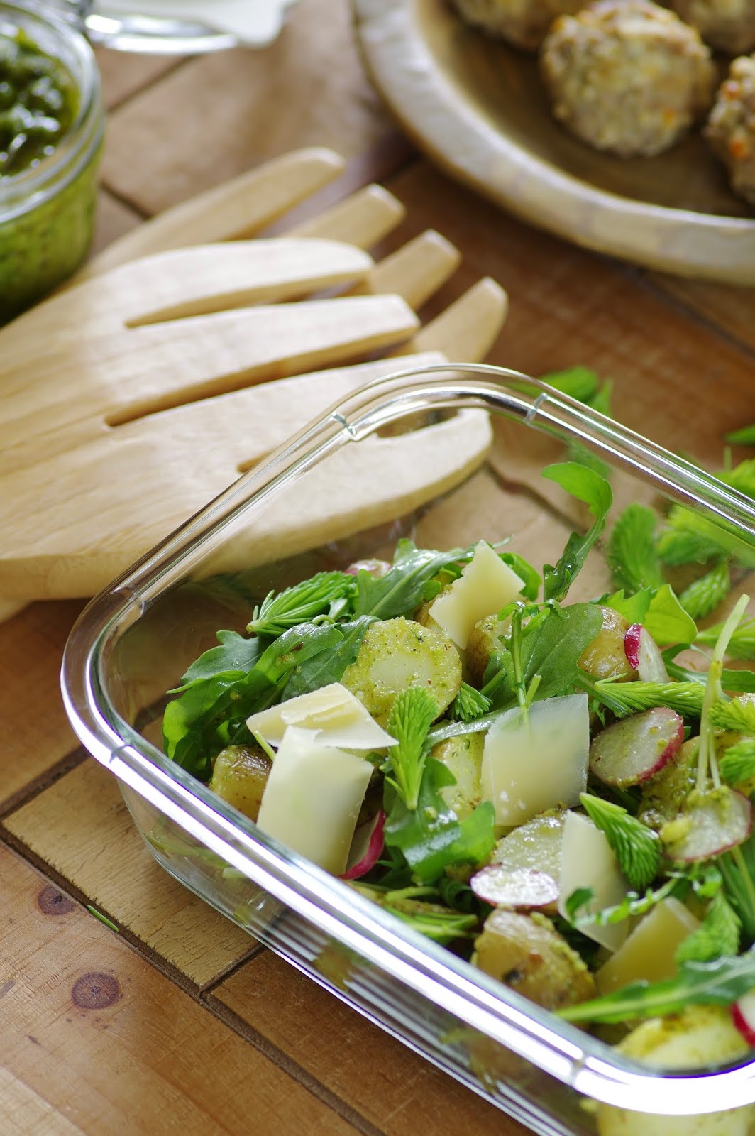 Salatisse läks kõik kevadiselt värske kraam – värske kartul, redis, rukola. Maitseks juustulaaste ja rukolapesto. Rukolapestot valmistasin nagu pesoto ikka, kõik ained blenderisse ja suristada ühtlaseks. Ülejäänud pestot saab edukalt säilitada suletuna külmikus ja süüa näiteks krõbedate burchettade peal.